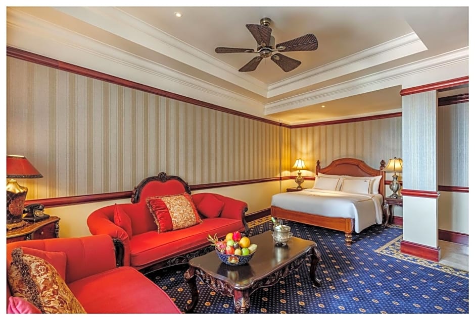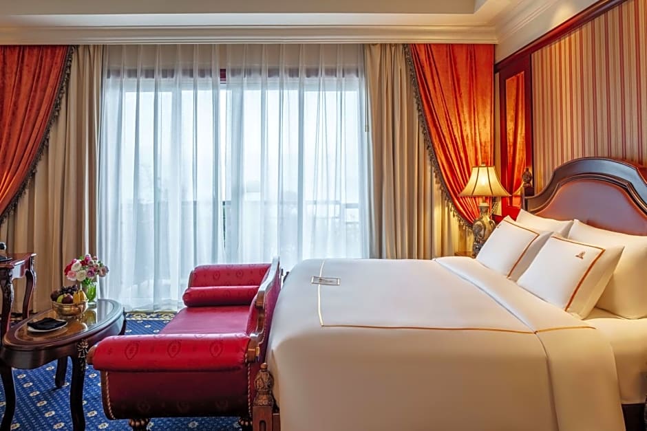 Heritage Deluxe King is 398 square feet and includes a king-size bed 150-183 width plus balcony, desk, cable tv, and hairdryer.